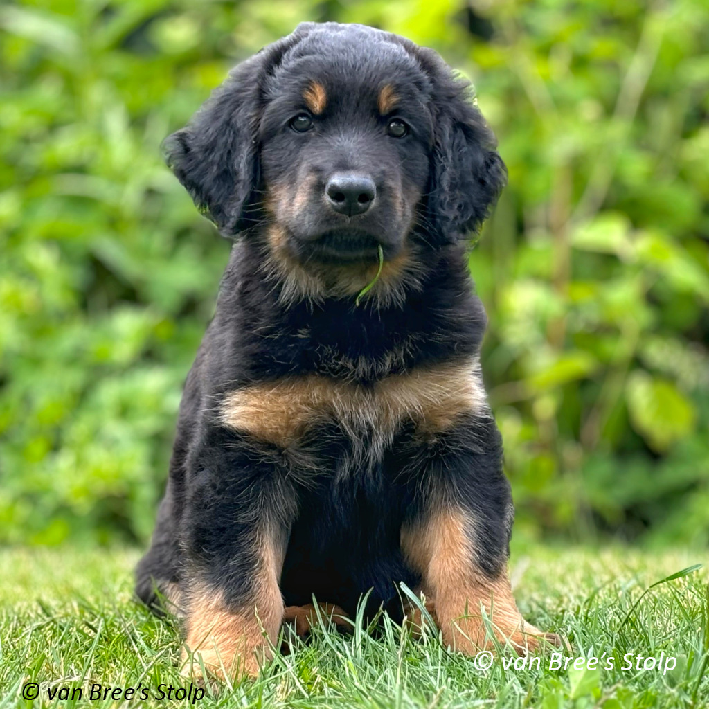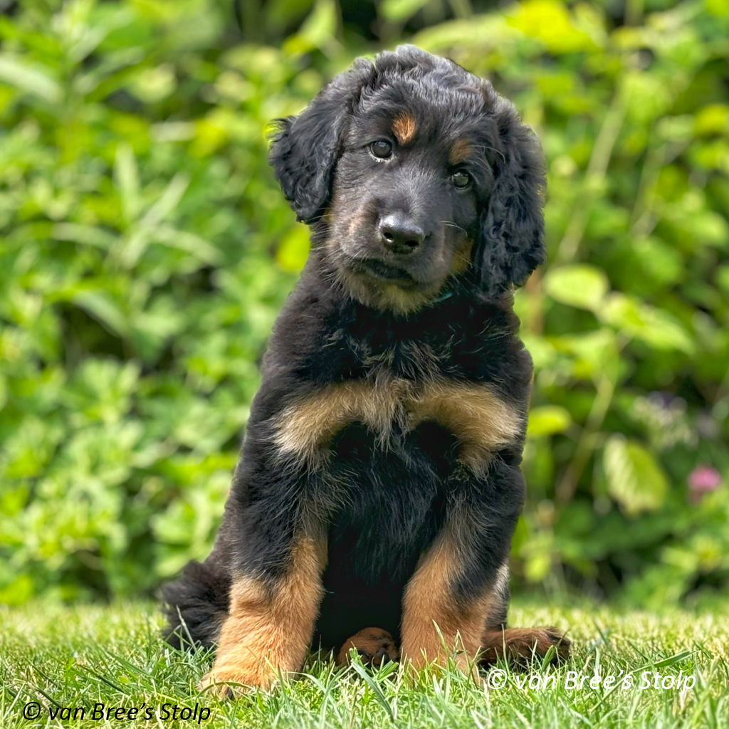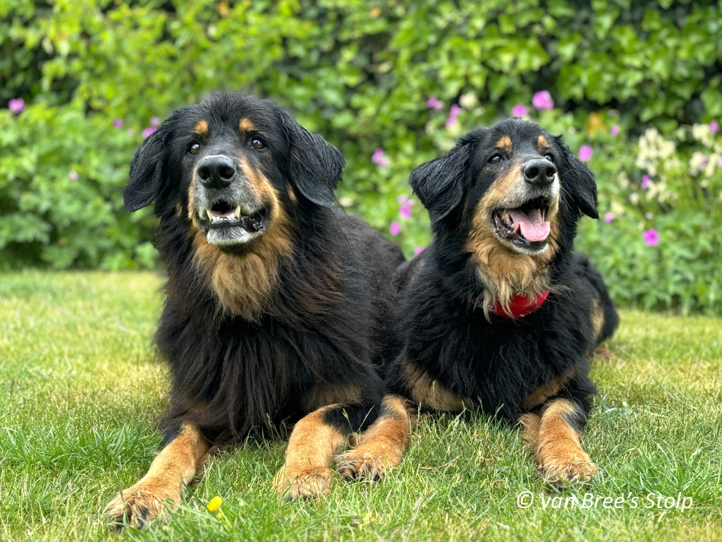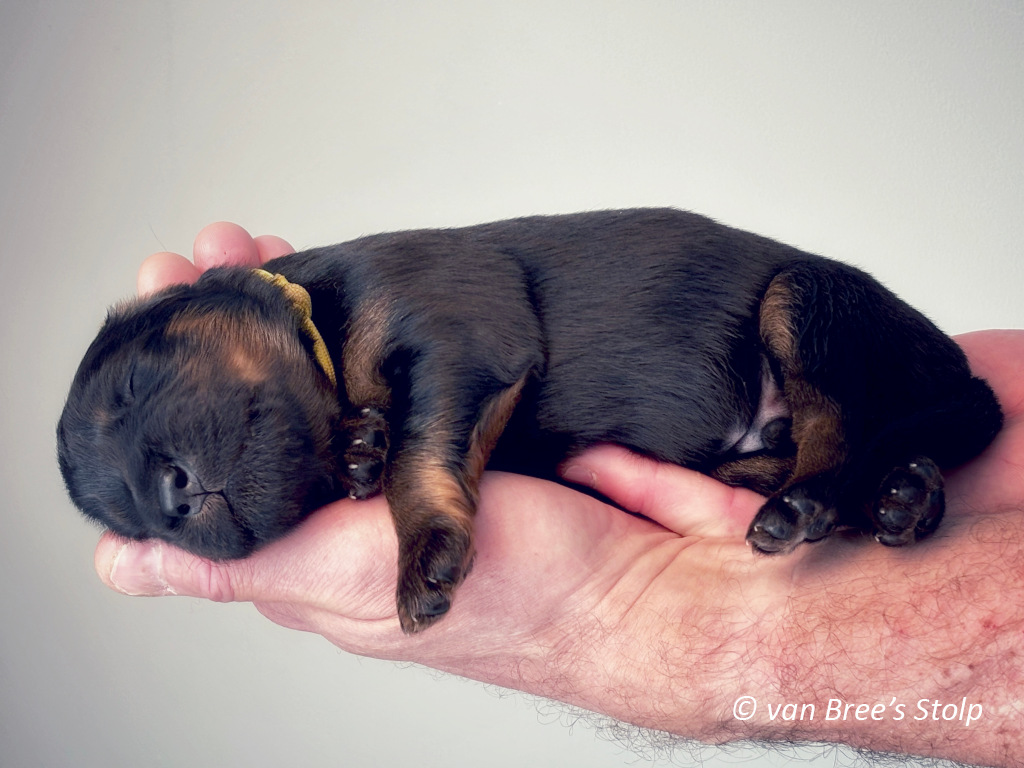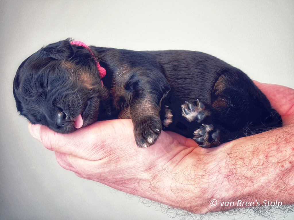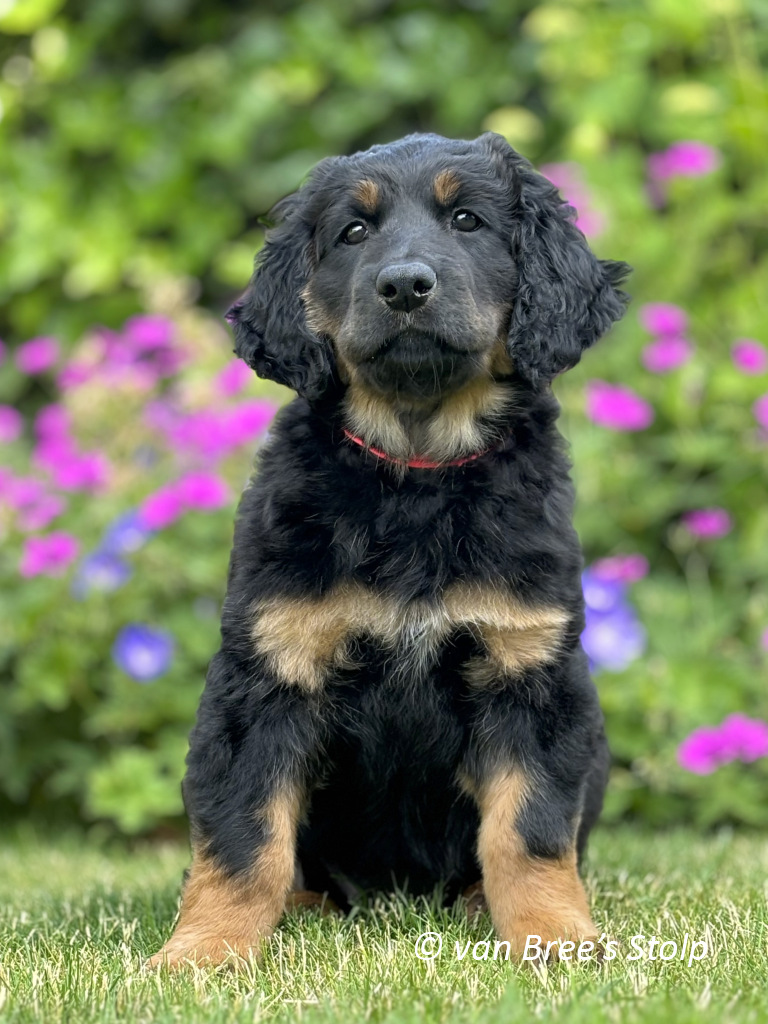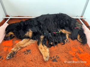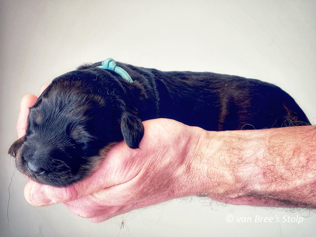 Uit deze combinatie verwachten we zwart-blonde en blonde pups.